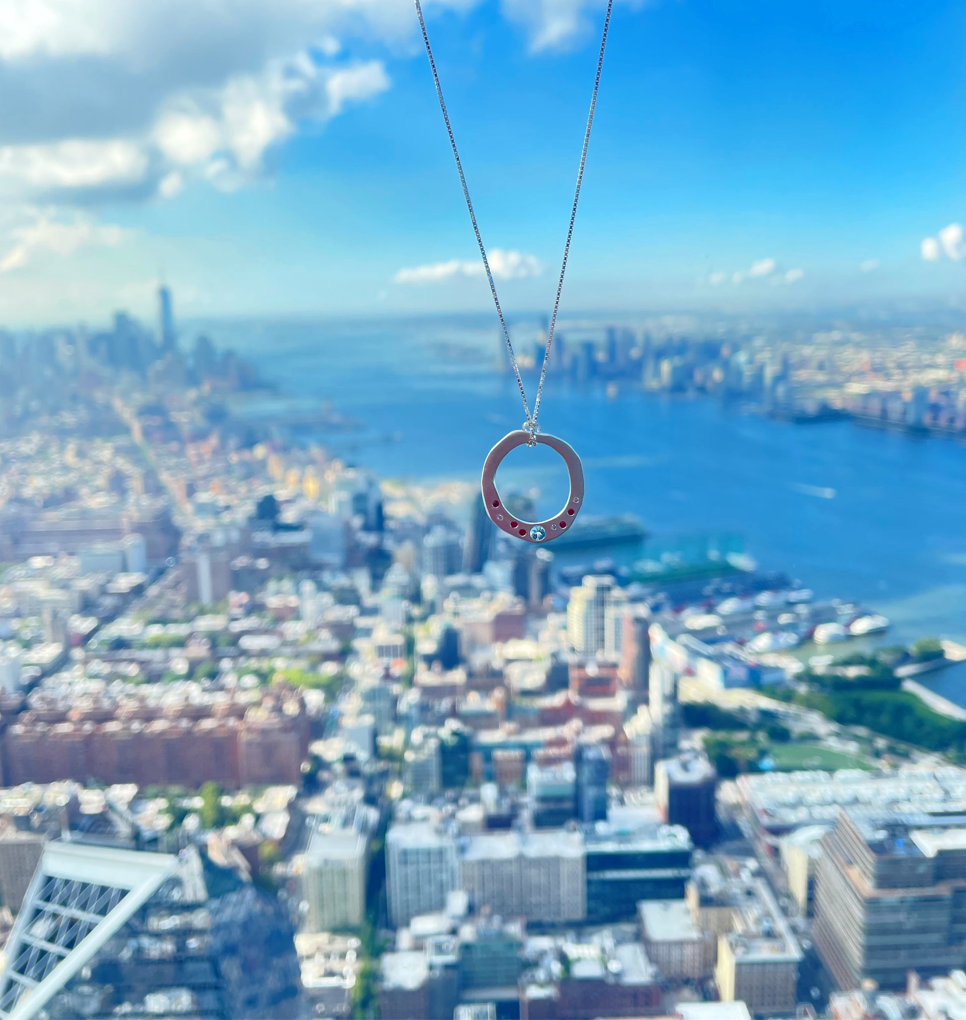 Anillo Colgante hecho a mano en Plata 950, con aguamarina, diamantes y rubíes.