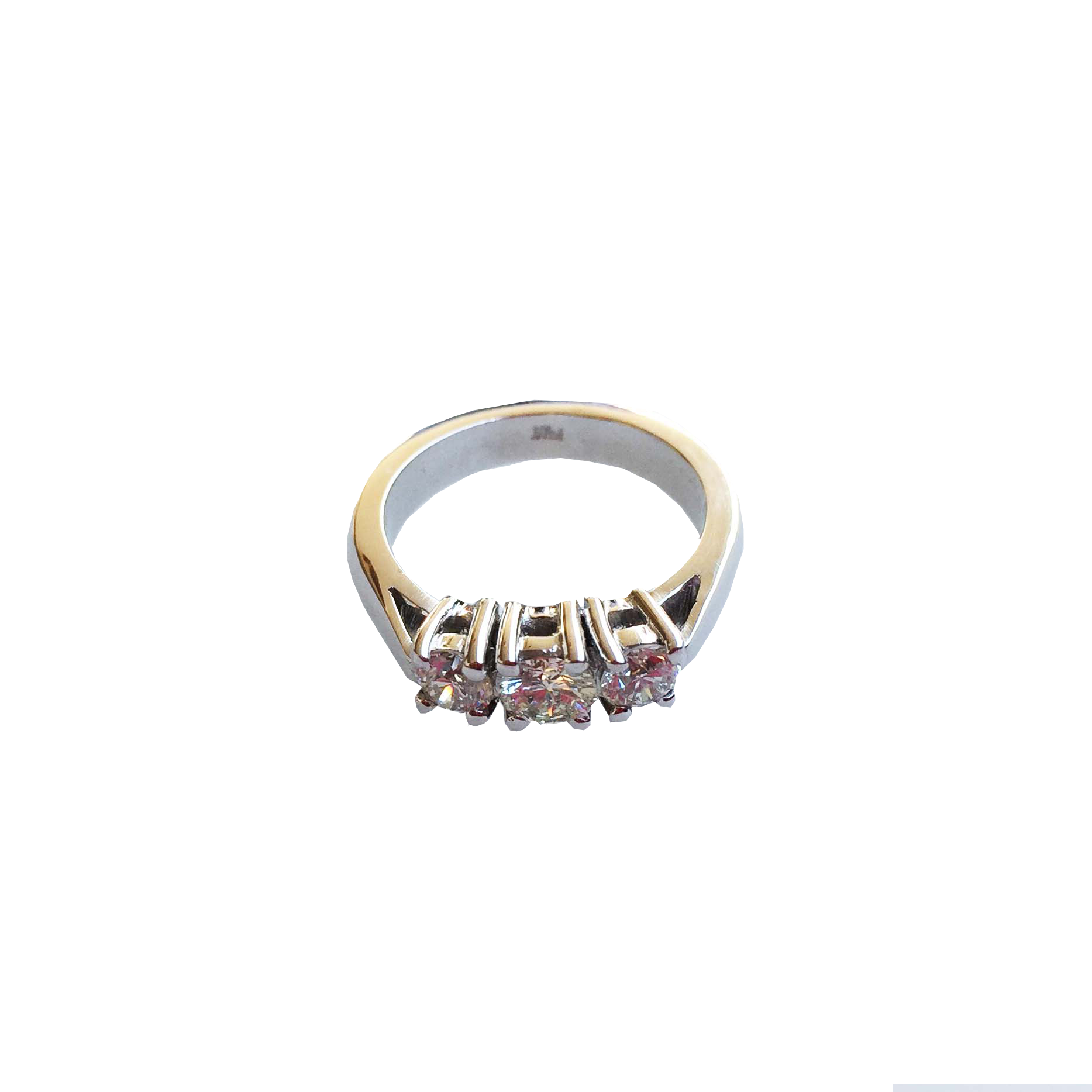 Anillo diseño Trecillo de diamante blanco natural central de 33 ptos y dos diamantes laterales de 20 ptos cada uno. Metal Oro blanco de 18 kilates.