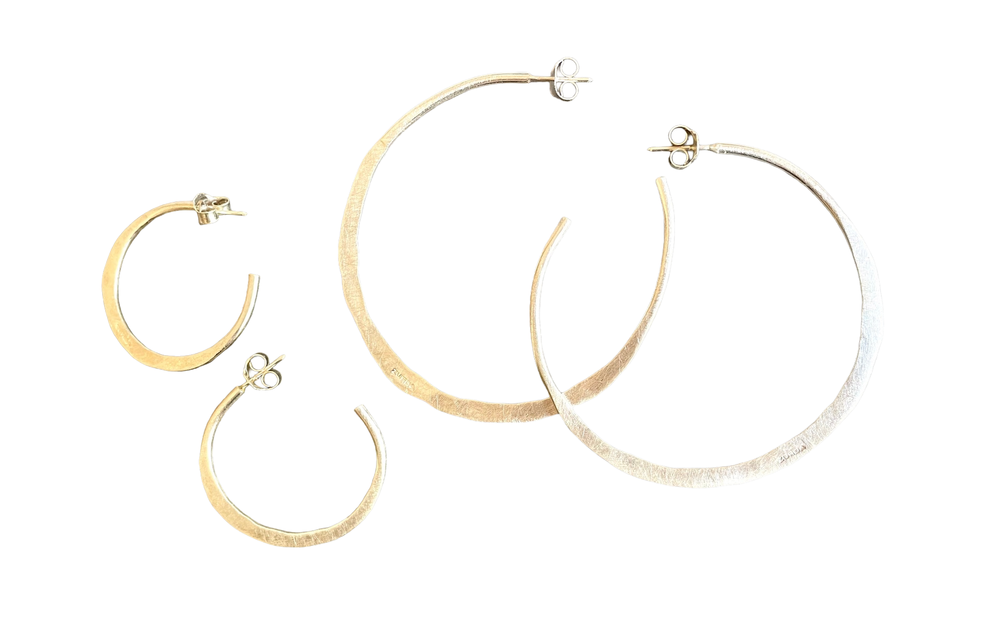 Aros tipo argollas, forjadas a mano con variación de espesor e inspiración tribal.