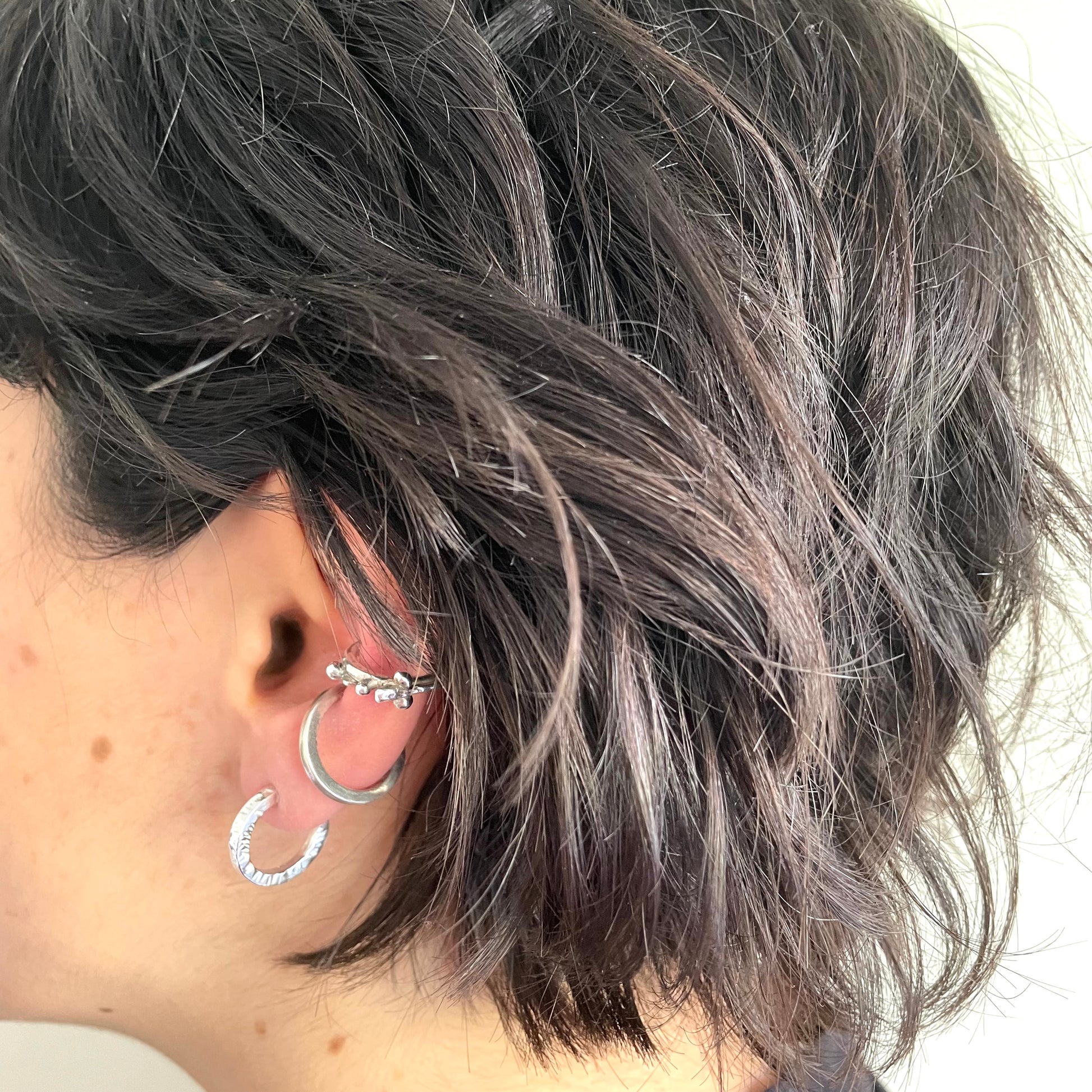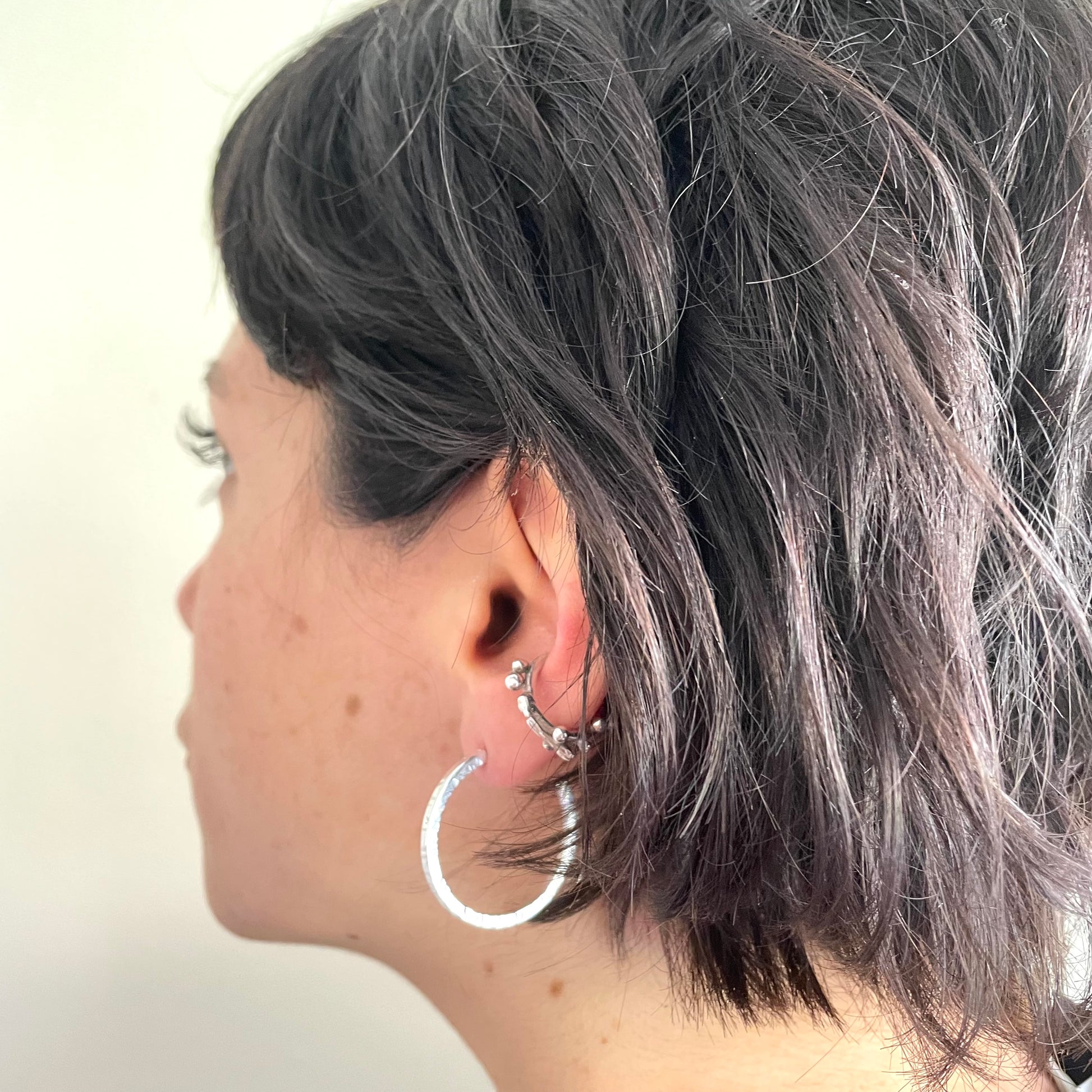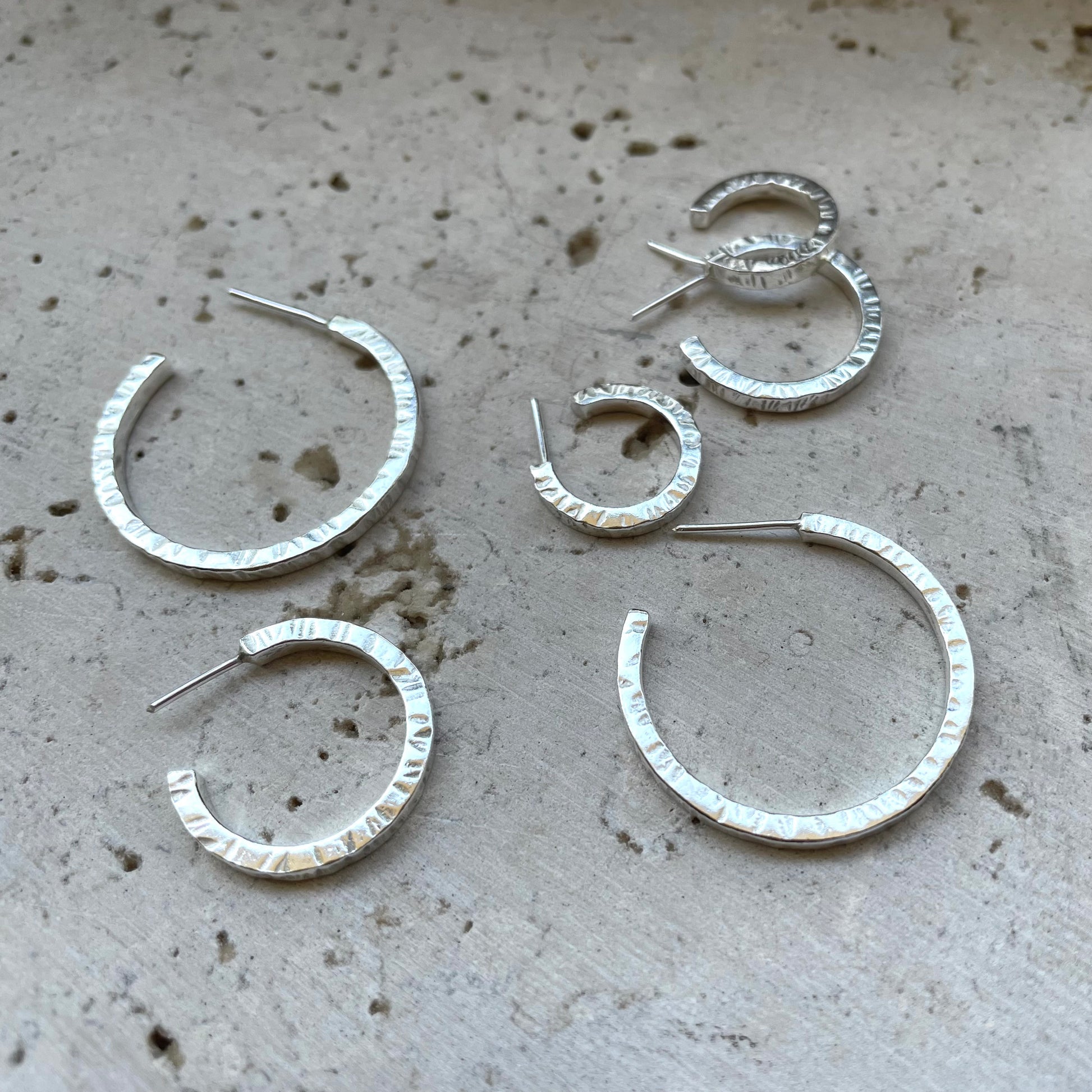 Aros tipo argollas, forjadas con textura. Disponibles en 3 tamaños y hechos en Plata 950.