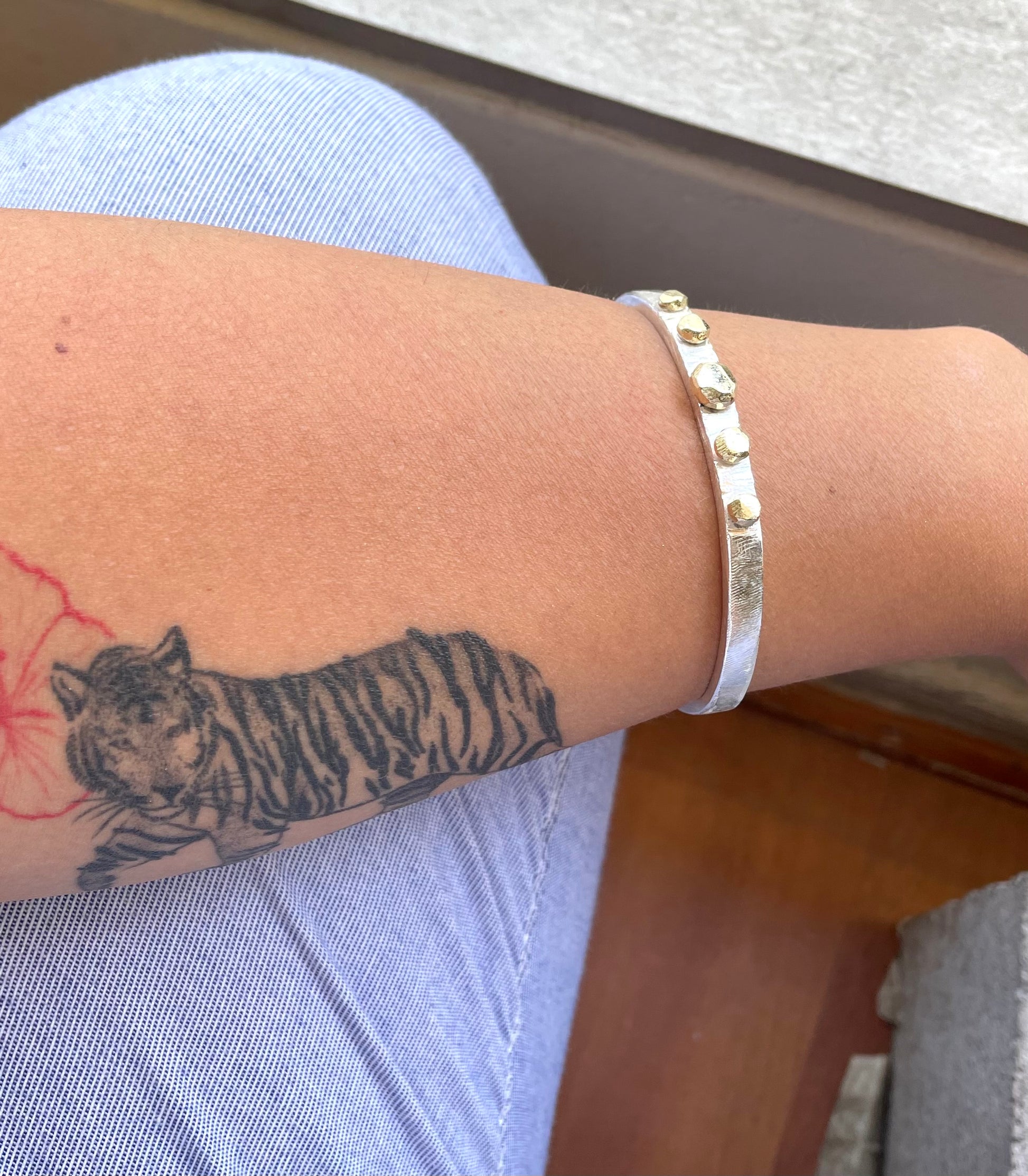 Brazalete de Plata facetado a mano, con 4 rocas de oro de 1 gr. y 1 roca de 2.5 grs. Cada una talladas a mano directamente sobre el metal, lo que hace a cada pieza única en diseño.